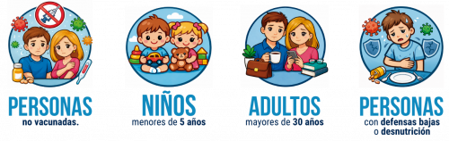 Es una enfermedad vírica sumamente contagiosa que se propaga con facilidad cuando una persona infectada respira, tose o estornuda. Puede causar síntomas graves, complicaciones e incluso la muerte, especialmente en bebés, niños pequeños, personas con defensas bajas y mujeres embarazadas. Los signos y síntomas aparecen entre 7 y 14 días después del contagio.